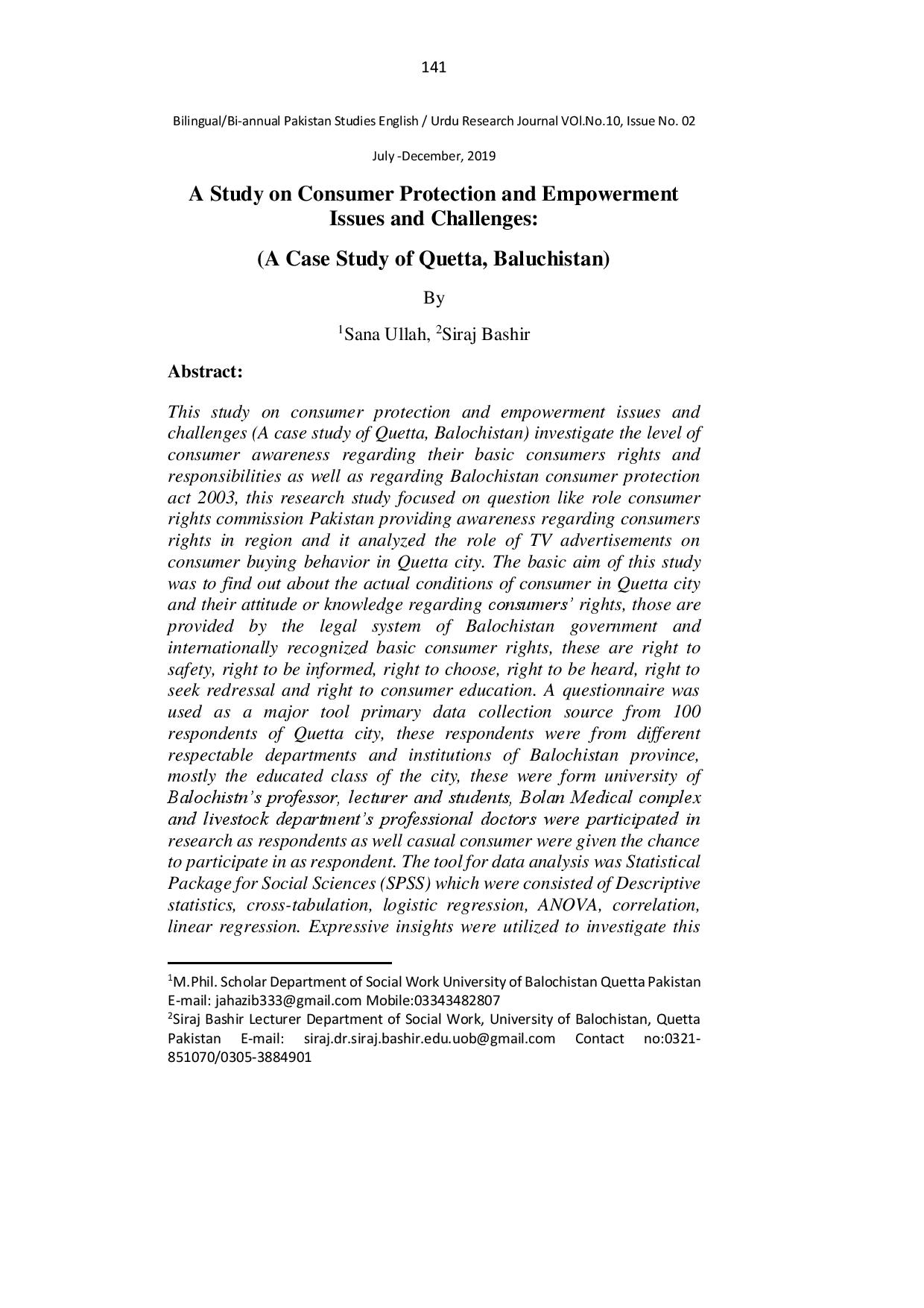 A Study on Consumer Protection and Empowerment Issues and Challenges A Case Study of Quetta Balochistan